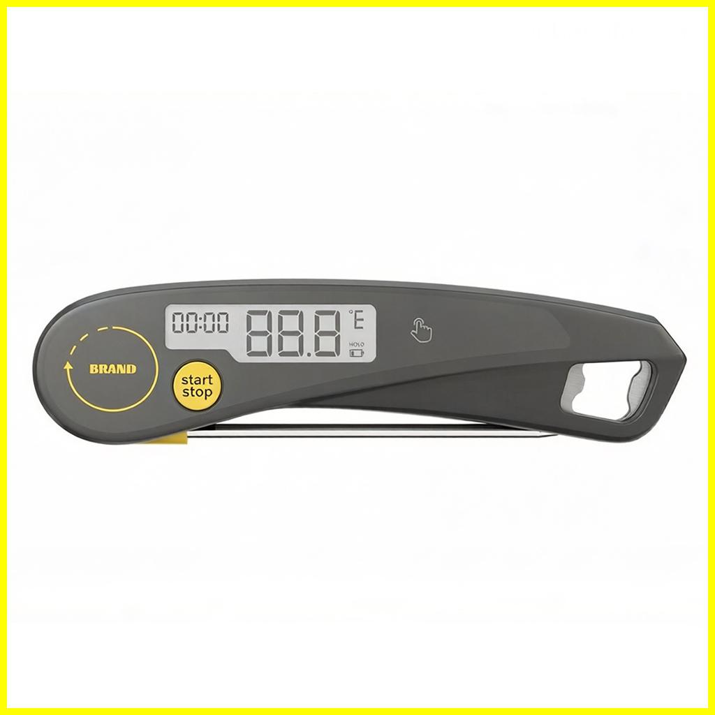 This digital food thermometer is designed for professional B2B buyers including e-commerce sellers, wholesalers, and OEM clients. Featuring a foldable stainless steel probe, it provides fast and accurate temperature readings from -50°C to 300°C with ±0.1°C precision. The built-in timer function (up to 59 minutes 59 seconds) supports efficient cooking control, while the °C/°F switch ensures global usability. Powered by a CR2450 button battery, it offers long-lasting performance. The ergonomic handle integrates a bottle opener, making it a practical 3-in-1 kitchen tool ideal for BBQ, grilling, baking, and food processing industries.