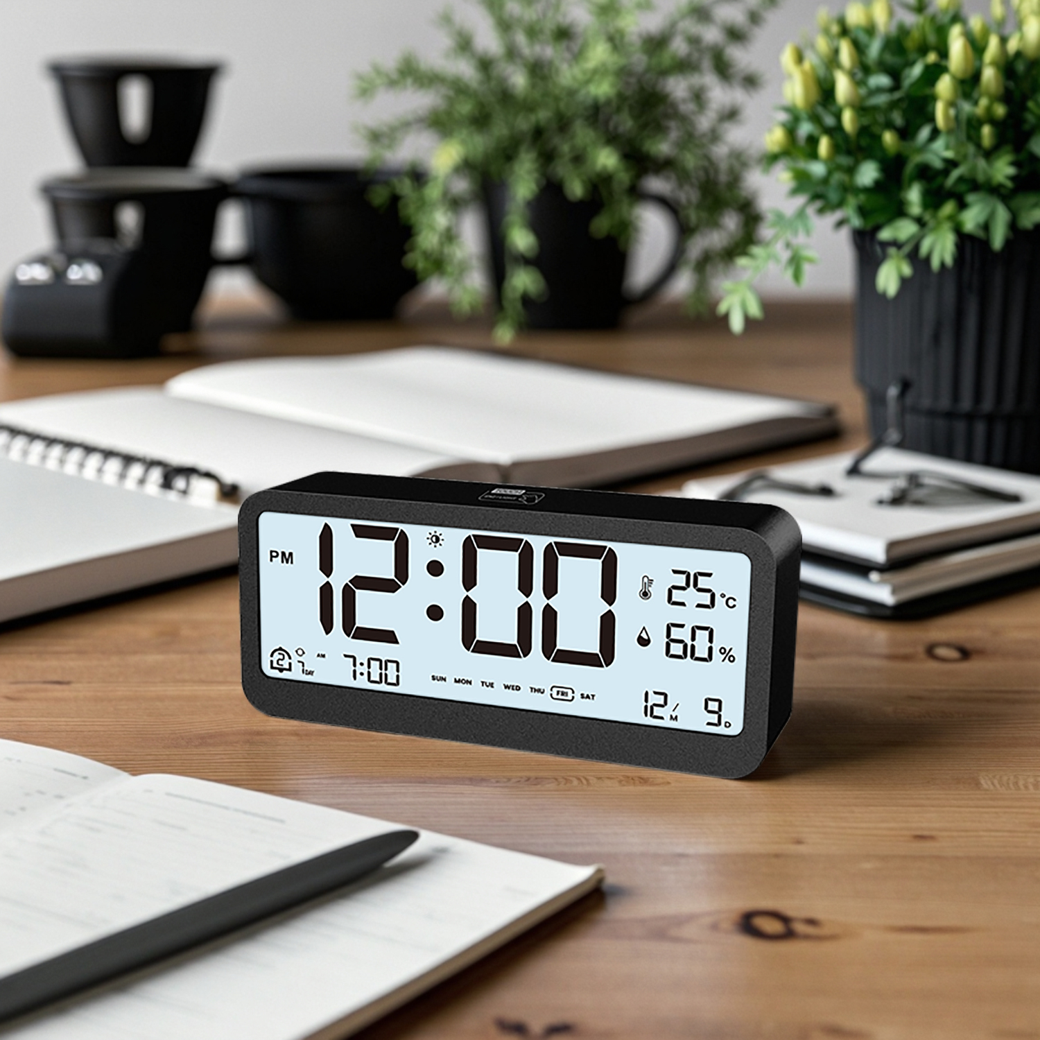 The X-NZ001 Bedroom Bedside Battery-Operated LCD Smart Table Digital Visual 24-Hour Time Calendar Alarm Clock with Thermometer Hygrometer Sensor is an innovative, multi-functional desktop device designed to streamline daily routines by integrating precise timekeeping, customizable alarms, and environmental monitoring into a sleek, compact form.